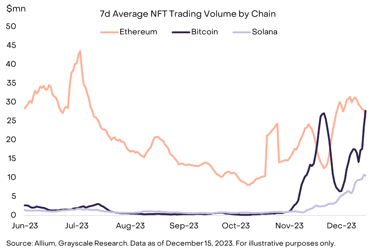 第三,与其他公链相比,以太坊主网的链上活动(在某些类别中)的恢复速度较慢。例如,自本季度开始以来, Solana 生态 NFT 交易量比以太坊生态 NFT 交易量增长得更快。由于 Ordinals 的兴起,比特币上的数字藏品交易也大幅增长(图 4);在 12 月下旬,由于大量 Ordinals 交易,比特币网络单日交易费用甚至超过以太坊。尽管 Grayscale Research 认为以太坊的 NFT 生态仍然具有建设性,但 Solana 和比特币网络最近在这一领域的链上活动占据了多数市场份额。