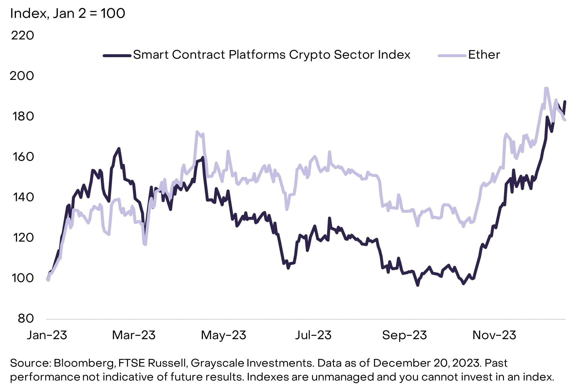 图表 3 :以太坊的表现与智能合约平台加密行业指数相一致