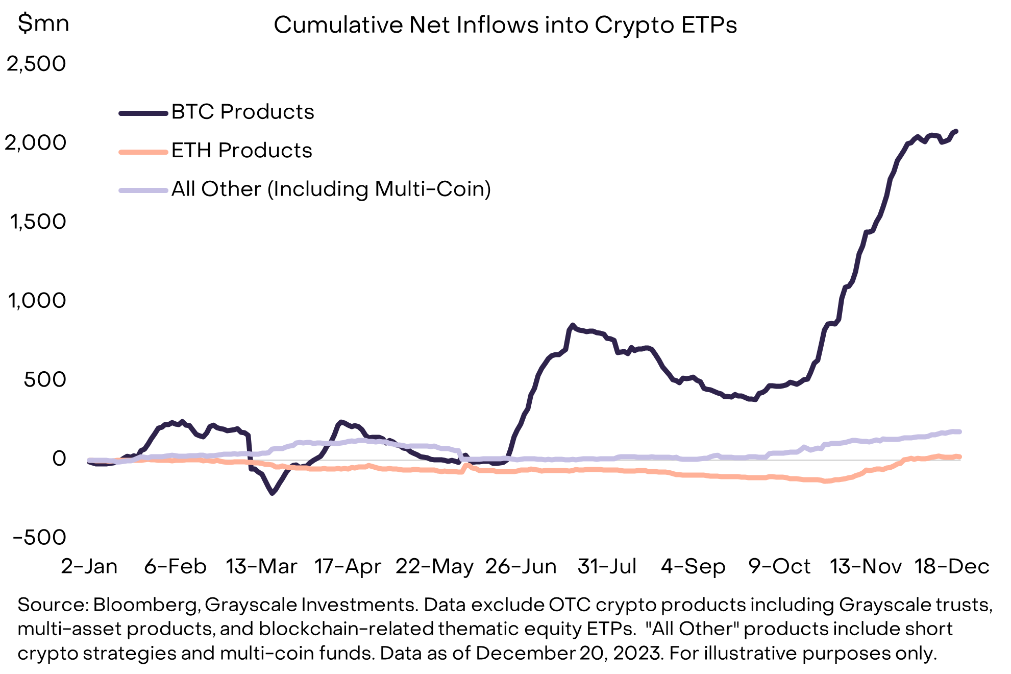 首先, 2023 年有几个比特币特有的积极因素,包括潜在的比特币现货 ETF 取得实质性进展,以及美国地区银行的不稳定,突显了比特币替代传统货币体系的作用。这些事件似乎推动了 2023 年以比特币为重点的加密投资产品的资金流入,让比特币今年的涨幅更高。例如,Grayscale Research 估计, 2023 年以比特币为重点的交易所交易产品 (ETP),包括美国的期货产品和海外的现货产品,净流入额约为 20 亿美元。相比之下,同期以 ETH 为重点的 ETP 的净流入额仅为 2400 万美元(图 2)。
