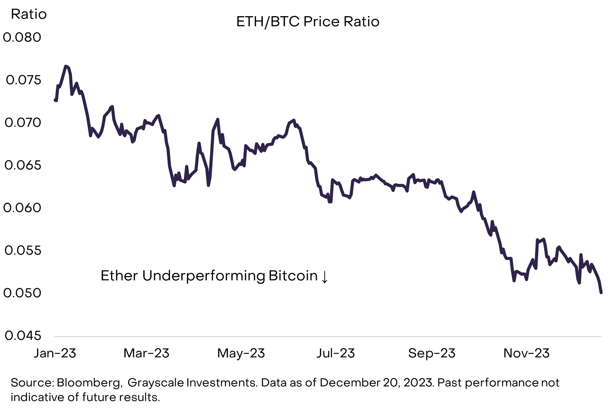 很少有人说一项资产上涨 82% “表现不佳”,但这就是 2023 年 ETH 所面临的情况。第二大加密资产今年的涨幅尚佳(价格波动相对较低),但仍远低于 BTC,后者今年的涨幅有望达到 162% 。ETH/BTC 比率全年下降,达 2021 年年中以来的最低水平(图 1)。Grayscale Research 认为,ETH 在 2023 年表现“不佳”有以下原因。