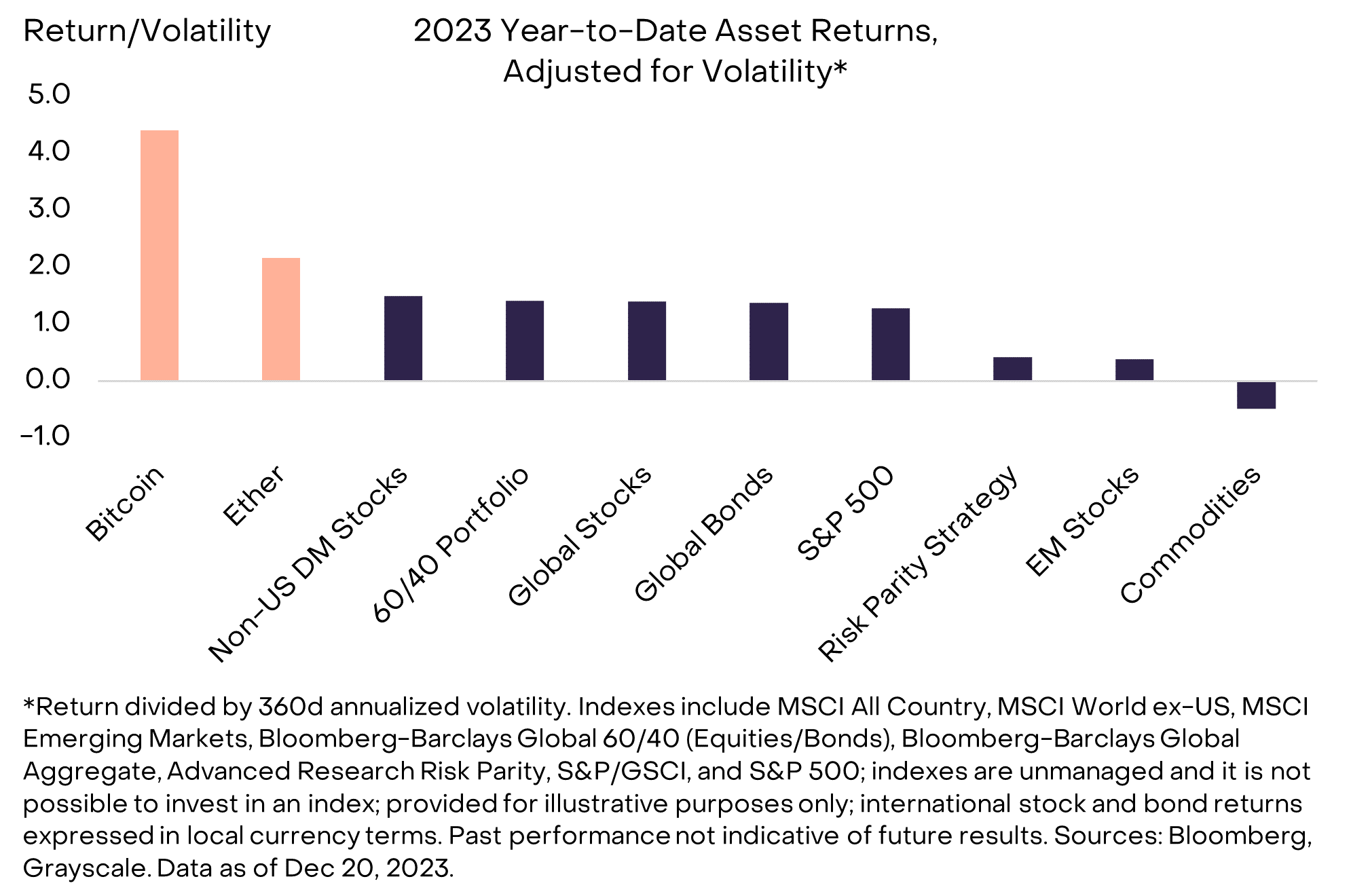 尽管 ETH 涨幅不及比特币,但 ETH 今年在绝对值和经风险调整后的表现依然优于传统资产。以太坊不断增长的L2生态系统可能会吸引新用户,并支持该代币在 2024 年的估值。