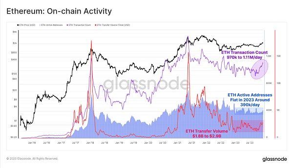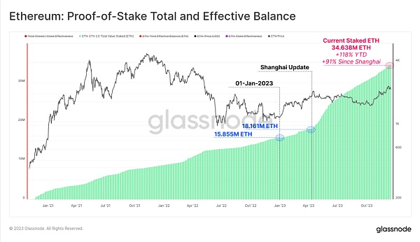 以太坊的另一个关键增长领域是通过PoS质押的 ETH 总量。2023年以来,ETH 的质押数量增长了 119%,目前锁定在质押协议中的 ETH 数量已超过 3463.8 万枚。上海升级也在 4 月份成功推出,自 2020 年 12 月信标链推出,首次允许质押者提现,并重新洗牌流动性质押提供商。