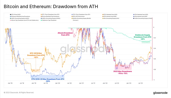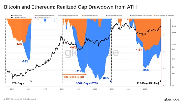 从链上角度来看,BTC 和 ETH 的已实现市值可以跟踪各自资本流动情况。2022 年熊市期间的总已实现市值下降达到了与之前周期相似的水平,BTC净资本流出18%,ETH 净资本流出 30%。