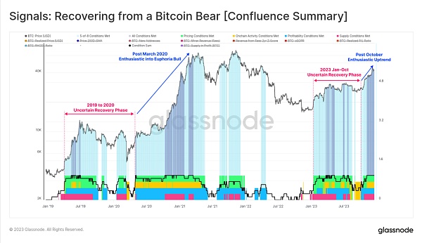 我们还可以明显看到“比特币熊市信号中恢复”,因为自 10 月份以来,所有八个指标(如下图)都进入了正值区域。2023 年的大部分时间里,各指标数据参差不齐,表现出与 2019-20 年期间非常相似的特征。