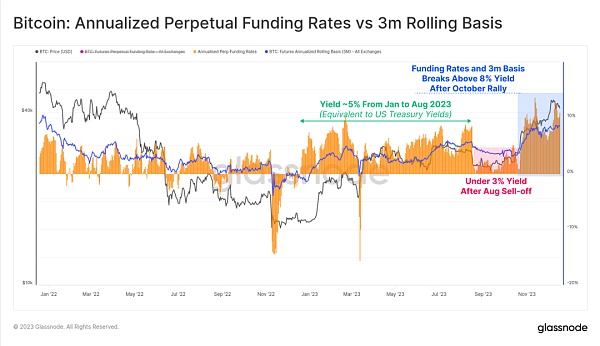 10 月起,收益率突破 8%。随着期货基准目前保持在高于美国国债300个基点的水平,做市商资本现在有了重返数字资产领域的动力。