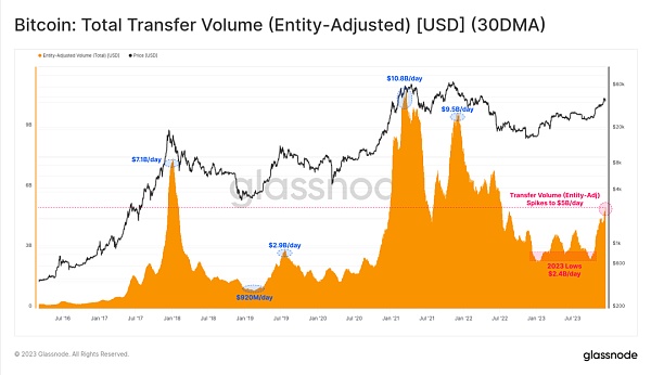 我们可以看到,10月之前比特币的交易量相对停滞,10 月份的上涨促使比特币的交易量翻了一番,从每天 24亿美元增加到每天超过 50亿美元,这是自 2022 年 6 月以来的最高水平。这再次向我们证明了“10 月份在某种程度上是市场阶段性转变”。