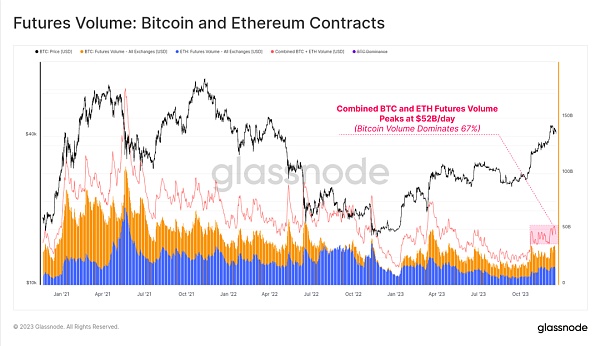10 月份 BTC 和 ETH 的期货交易量均有所上升,每日总交易量为 520亿美元。比特币合约占交易量的 67% 左右,而以太坊合约占 33%。