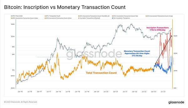 (红色)铭文交易在比特币交易的基础上每天额外增加 175,000 至 356,000 笔交易。