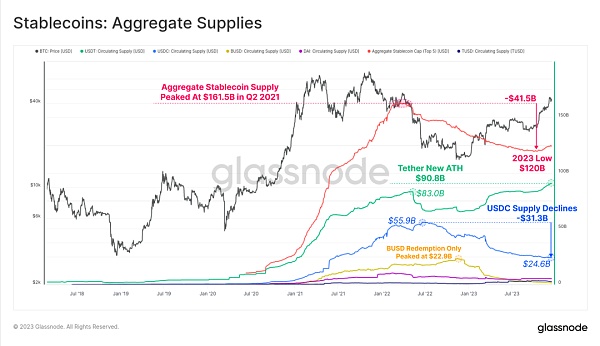 自 2022 年 3 月以来,稳定币总供应量一直在下降,较峰值下降了26%,成为市场流动性的主要阻力。这是由于监管压力(SEC 指控 BUSD 为证券)、资本轮换(选择美国国债而不是无息稳定币)以及投资者对熊市的兴趣减弱等综合因素造成的。