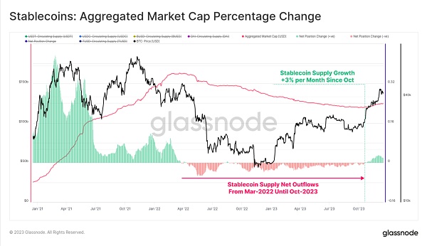 然而,10 月是一个关键点,稳定币总供应量触底于 $1,200亿,供应量开始以每月高达 3% 的速度增长。这是自 2022 年 3 月以来稳定币供应量的首次扩张,也可能是投资者兴趣回归的迹象。