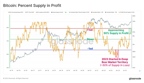 另一方面是,10 月份的反弹使“盈利”供应量占比高于历史平均水平,占流通供应量的 90% 以上。鉴于 2023 年初时超过 50% 的供应量处于“亏损”状态,这是历史上最快的复苏之一(仅次于 2019 年的反弹)。