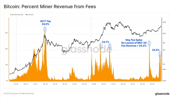 铭文——比特币区块空间的新买家,使开采者的费用收入大幅增加,2023 年有几个区块支付的费用甚至超过了 6.25 BTC 的区块奖励。今年出现了两次费用大幅上涨,目前费用约占开采者收入的四分之一。这与 2017 年和 2021 年牛市的欣快阶段相当。
