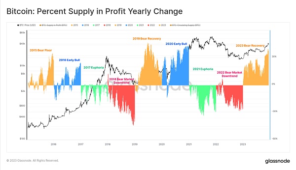 下图直观地展示了自 2015 年以来每年的盈利供应百分比变化。虽然按年份划分并不完全合适,但每四年的比特币周期让我们发现了一些有趣的规律: