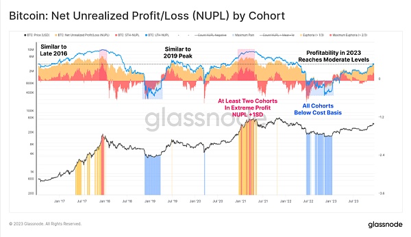 最后我们可以讨论投资者的盈利能力,2023 年将长期持有者、短期持有者和普通持有者从无利可图转变为适度盈利的状态。每个群体的 NUPL 指标虽尚未达到令人振奋的高点,但也明显高于各自群体的基础成本水平。