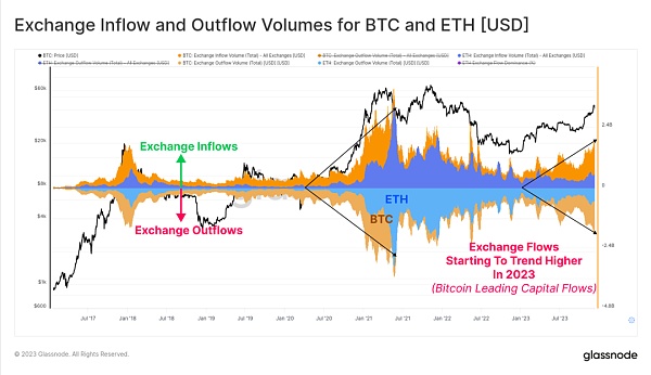 2023年比特币和以太坊的交易平台流入和流出量有所增加,表明市场对现货交易的兴趣增加。值得注意的是,比特币交易量的增长速度明显快于以太坊交易量,这与比特币主导地位不断上升的观察结果一致。在长期熊市之后,我们常常看到的是比特币带领投资者信心走出低迷情绪,下面这张图表有助于直观地展示这一现象。