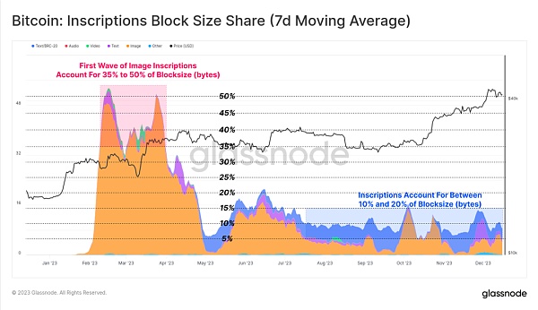 有趣的是,虽然铭文交易量约占已确认交易的 50%,但令人惊讶的是,它们仅占用区块空间的 10% 至 15% 左右。这是因为文本文件较小以及与 SegWit 的数据折扣。