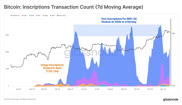 2023年,比特币交易数量创下历史新高,这主要是由于 Ordinals(序数)和 Inscriptions(铭文)的出现。这些交易将文本文件和图像等数据嵌入交易的签名部分。
