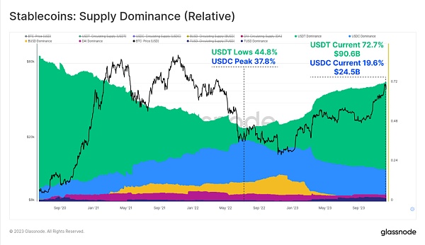 各种稳定币之间的相对主导地位在2022年至2023年间也发生了显著变化。此前上涨的稳定币如USDC和BUSD的主导地位已大幅萎缩,BUSD进入仅限赎回模式,而USDC的主导地位自2022年6月以来从37.8%下降至19.6% 。