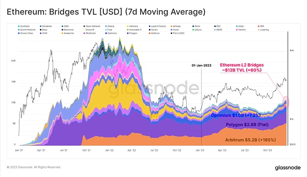 虽然 ETH 价格表现落后于大部分数字资产,但其生态系统仍在不断扩大、成熟和发展。特别是,锁定在不断扩大的 Layer-2 区块链中的总价值增加了60%,其中超过 120亿美元锁定在跨链桥中。
