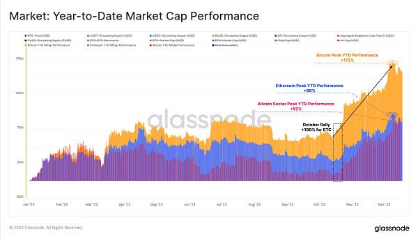 2023 是令加密行业难忘的一年,比特币上涨超过 172%。其他数字资产表现也相当强劲,以太坊和大部分山寨币的市值增长了 90% 以上。
