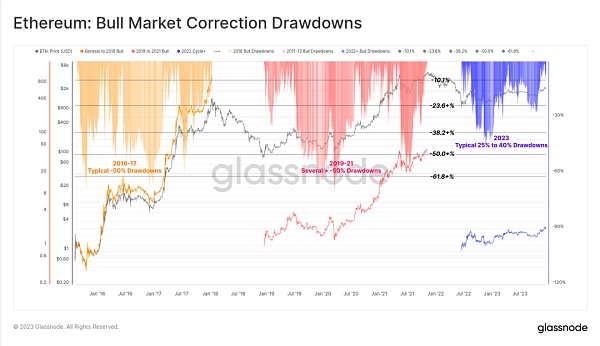 2023 年另一个独特表现是比特币所有价格回调的深度都非常浅。从历史上看,比特币在熊市复苏和牛市上升趋势期间通常会从局部高点回调至少 25%,甚至很多时期超过50%。