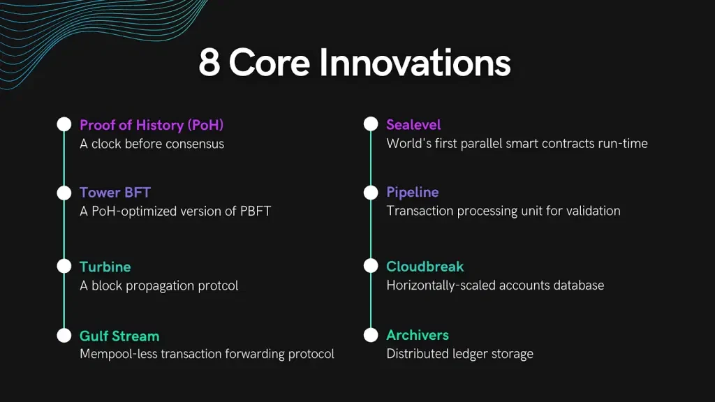 Solana 在区块链技术创新方面的主要特点是引入了一种全新的共识机制,它基于历史证明(PoH)算法和快速同步引擎实现。与传统的仅依赖密码技术的共识算法不同,PoH 利用去中心化时钟来建立 Solana 网络上的交易和事件的顺序。通过高效跟踪这些交易的顺序,它提高了网络的整体效率,这与其他区块链可能存在交易顺序不明确的情况不同。