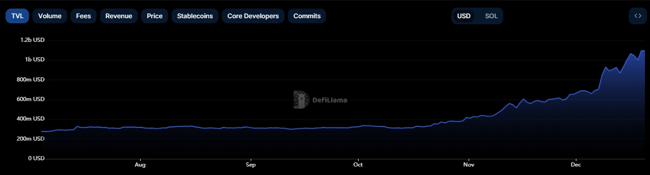 2023 年 12 月,Solana 生态复苏,锁仓量在两个月内从 3 亿美元左右上涨至目前的近 10 亿美元。