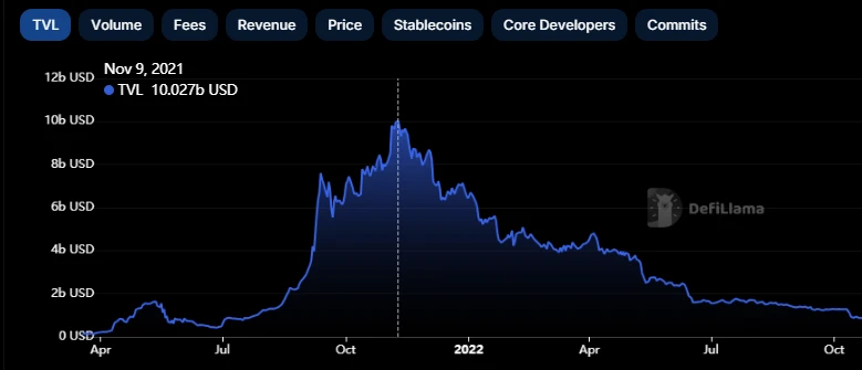 2021 年 11 月,Solana 锁仓量达到 10 亿美元,为同时期 Ethereum 的十分之一、BSC 的三分之二。