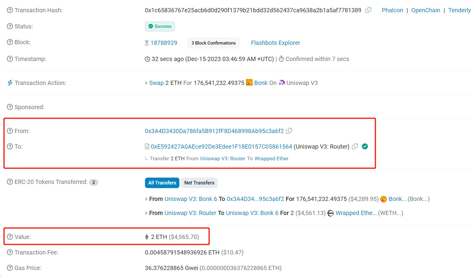 区块链上没有秘密,DeFi 的数据透明度也是无可争议的。以 Uniswap V3上的某一笔 交易 为例,我们可以通过 Etherescan 网站轻松查看该交易详情(如图 1 所示)。例如,地址 0 x 3A 4 D...a 6 f 2 在 Uniswap V3上用 2 WETH 兑换了 17, 654, 123, 249, 375 Bonk,交易费用为 0.0046 Ether。这些交易中的发送者(From)、接收者(To)、交易金额(Value)以及手续费(Transaction Fee)等关键信息都是公开可查的。