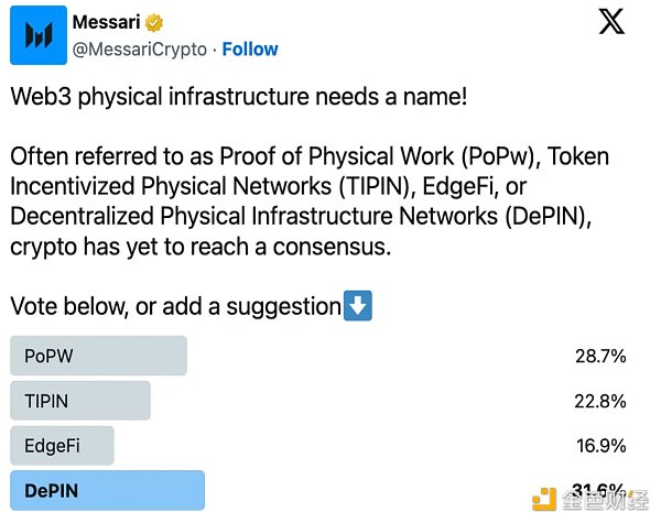 2021年,专注于物联网公链的IoTeX将这条赛道命名为MachineFi,后来又出现了“通证激励物理网络”等其他名称。2022年11月,Messari对Web3物理基础设施赛道名称进行了投票,DePIN成为此后的统一名称。