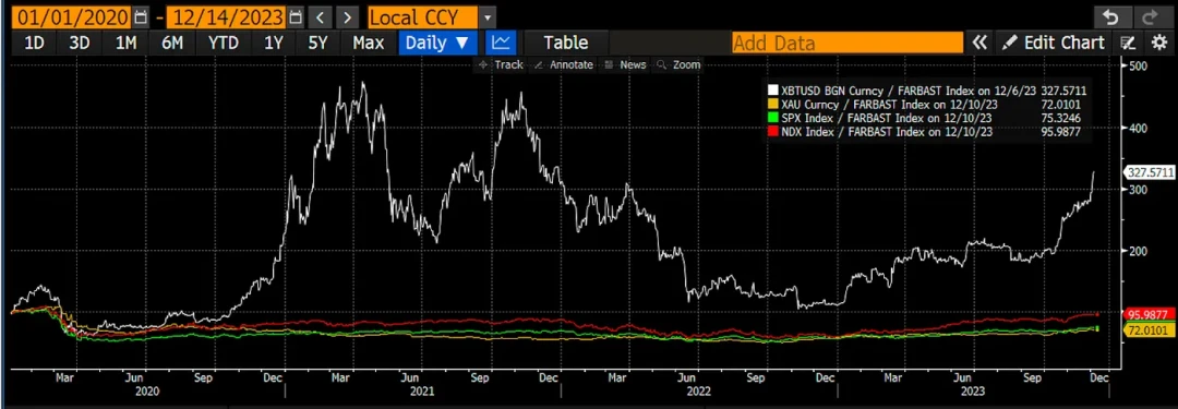 这是我最喜欢的图表之一,清晰地显示比特币,或者说是广义上的加密货币,是法币贬值交易的最佳表达方式。我将比特币(白色)、黄金(黄色)、标普 500 指数(绿色)和纳斯达克 100 指数(红色)的价值进行了通货紧缩调整,基准是美联储资产负债表,将它们在 2020 年 1 月 1 日起的表现进行了指数化(起点为 100)。比特币上涨了 228% ,远超过其他所有高风险资产。