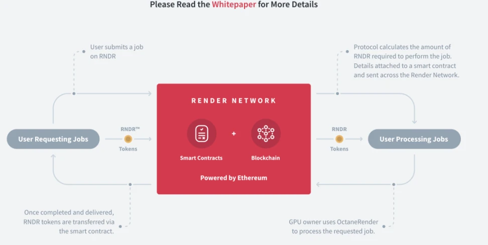 The Render Network 提供去中心化的基于 GPU 的渲染解决方案,旨在连接需要渲染作业的用户和拥有闲置 GPU 进行处理的人。所有者将他们的 GPU 连接到 Render Network,使用 OctaneRender 接收和完成渲染作业。用户将 RNDR 发送给执行渲染工作的个人,而 OTTOY 则收取一小部分 RNDR 作为交易 facilitation 和运行 Render Network 的费用。