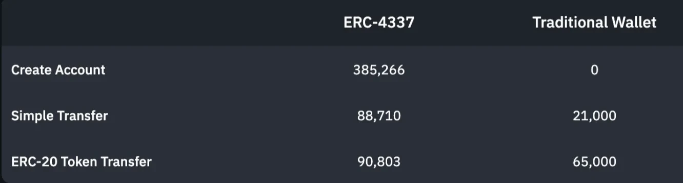 使用 ERC-4337 进行简单转账的成本要比使用传统钱包(通常称为 EOA)高得多,因为前者需要调用合约。