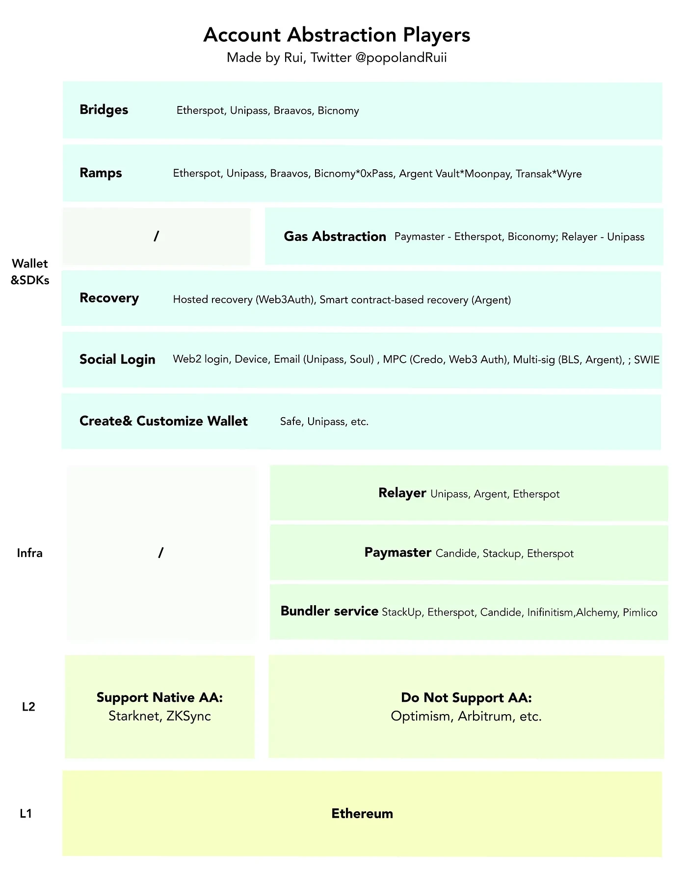 目前,一些优秀的项目如 Stackup、Etherspot、Candide、Infinistism、 Pimlico 都在尝试构建基础设施。