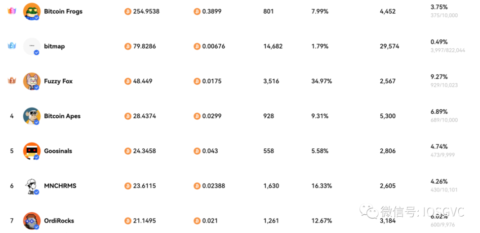对于 Ordinals NFT,我们对比其 30 日成交数据和 7 日成交数据,可以发现,项目的波动性较大,交易量前十的项目在一个月内的交易分布不均,在 FOMO 的时间段内换手率高,但进入平静期后流动性较差。