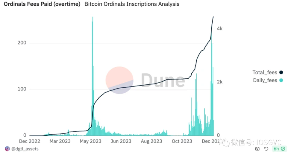 对矿工群体来说,比特币减半在即,出块奖励的激励减少,Ordinals 使链上交易费用增加自然是符合其利益诉求。自年初 Ordinals 上线比特币主网以来,铭刻的手续费已经超过了四千个比特币。