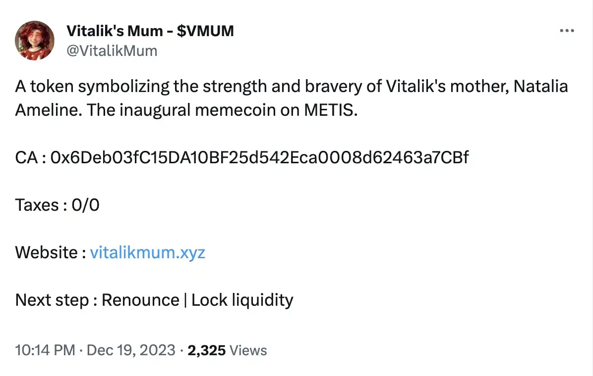 VMUM 是一个打着「Vitalik 母亲」名号的 meme 币,于 12 月 19 日部署,据 DEX SCREENER 数据,截至撰稿时,VMUM 目前价格为 0.00007512 美元, 24 小时上涨 508% 。