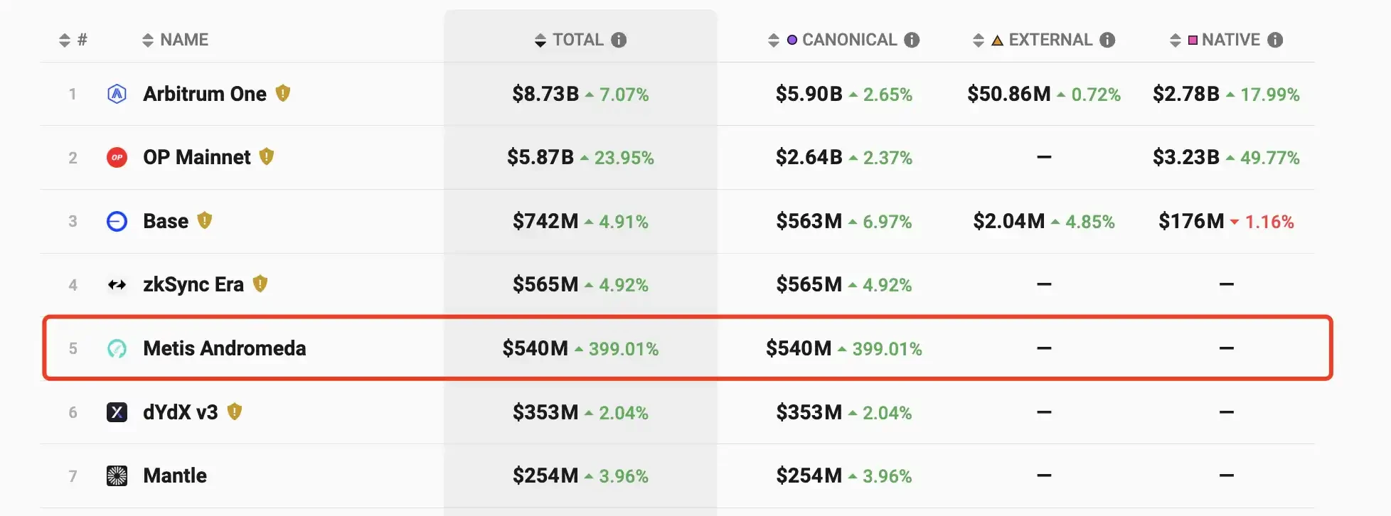 今日,据 CoinGecko 数据,截至撰稿时,Metis 原生代币 METIS 价格突破 70 美元,价格达到 76 美元, 7 日涨幅达 191.3% ;另据 L 2B EAT 数据显示,Metis 总锁仓量(TVL)攀升至 5.4 亿美元, 7 日涨幅达到 399% 。