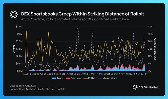 尽管如此,DEX 体育博彩表现相当不错,市场份额约为 Rollbit 的 20% 。