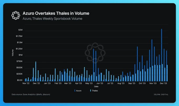 部署在 Polygon 和 Gnosis 链上的 azuro 尽管起步缓慢,但最近超越 Thales 成为交易量最高的 DEX 体育博彩。