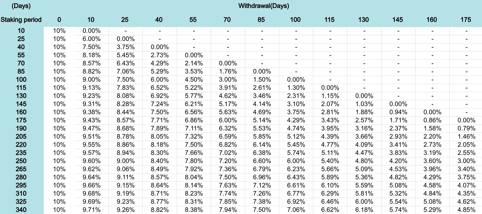 DEGO 质押天数与提前质押率对应表;图源:Dego Finance 官方文档