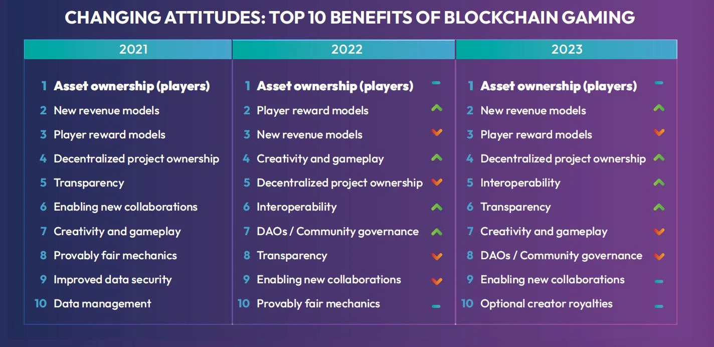 在 2023 年的调查采访中, 76.2% 的受访者认为,玩家的资产所有权是区块链能够给玩家带来的最大好处。而自 2021 年开始调查以来,这也一直是业内专业人士的普遍共识。