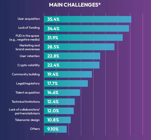 超过半数的受访者表示,获取新用户仍是该行业面临的最大挑战。尽管采用了免费拥有和免费游戏(F 2 P)模式,并将区块链元素作为可选项,让可访问性方面有所改进,但引流拉新问题仍阻碍着行业发展势头。
