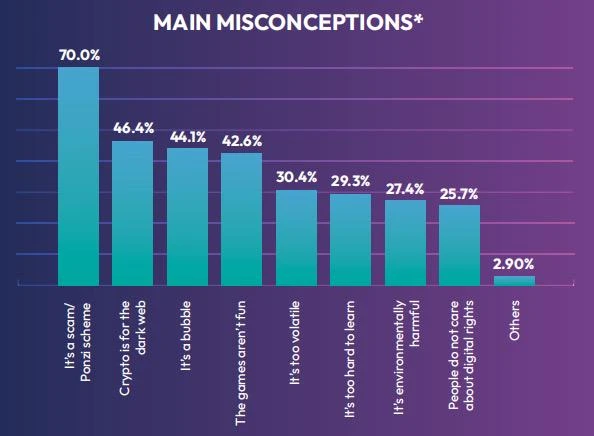 自 2021 年以来,受访者认为围绕区块链游戏的最大误解是人们认为它是骗局或庞氏骗局。2023 年, 70.0% 的受访者认为这仍然是关于该行业的最大谬误。2022 年,这一比例为 69.5% , 2021 年为 59.0% ,这表明区块链游戏专业人士更加关注这一误解。