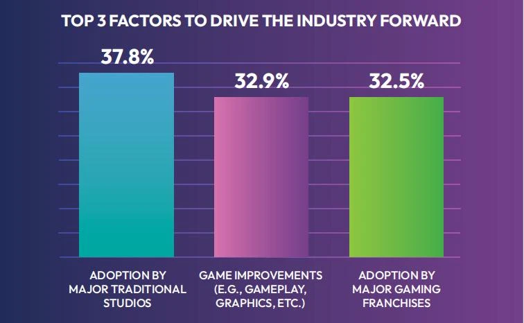 除了大型Web2游戏工作室采用Web3外,游戏改进是另一大驱动因素,几乎占调查问卷的三分之一。自 2021 年以来,这两个因素一直位居榜单一二名,而且它们是相辅相成的——大型传统工作室可以带来经验和人才,以将更多Web3游戏推向市场,并将更多的Web3 游戏提升到与Web2游戏相同的水平。