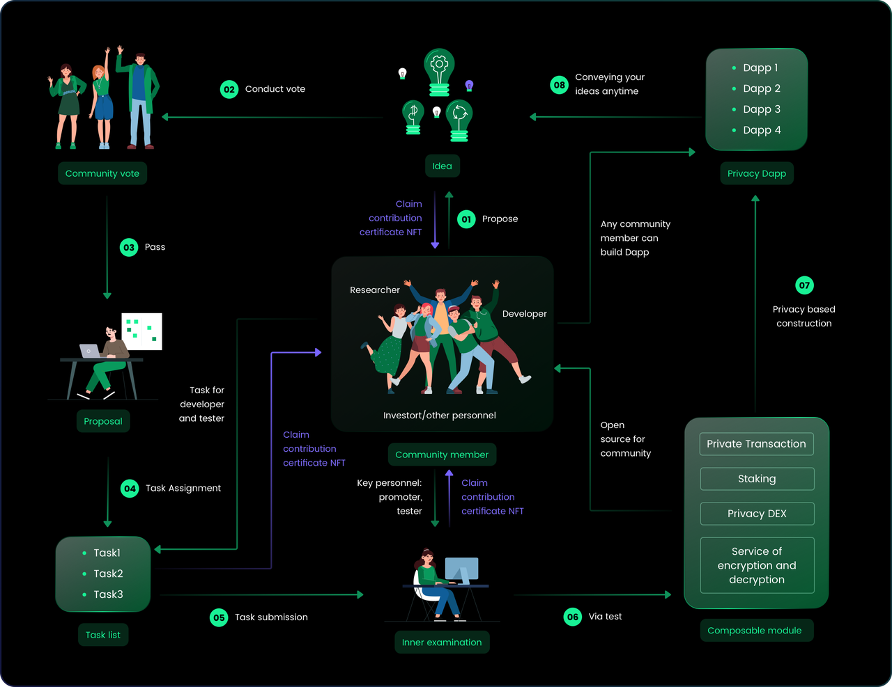 Tusima 是一个基于 DAO 驱动的多链兼容隐私网络,旨在为用户提供内容隐私和身份隔离,并消除跨链通信壁垒。Tusima 的 MVD 设计思路允许社区通过提出想法来达成共识,每个成员都是利益分享者,既是消费者,又是产品驱动者和测试参与者。在这种社区驱动的方法下,Tusima 可以实现用户自下而上的贡献,推出符合 DAO 的动机和价值观的产品。