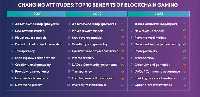在 2023 年的调查采访中,76.2% 的受访者认为,玩家的资产所有权是区块链能够给玩家带来的最大好处。而自 2021 年开始调查以来,这也一直是业内专业人士的普遍共识。