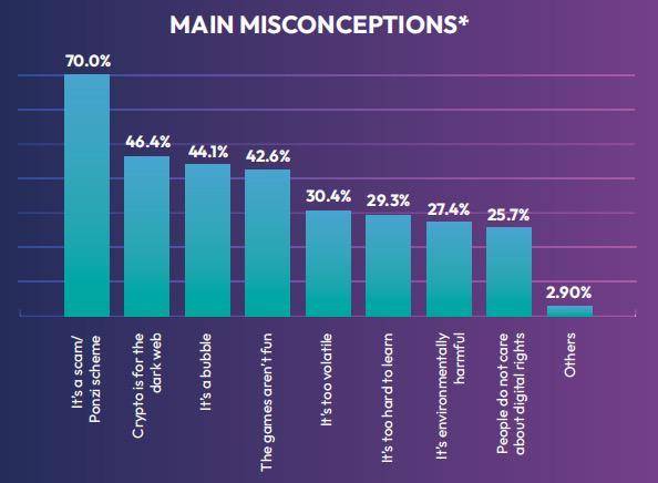 自 2021 年以来,受访者认为围绕区块链游戏的最大误解是人们认为它是骗局或庞氏骗局。2023 年,70.0% 的受访者认为这仍然是关于该行业的最大谬误。2022 年,这一比例为 69.5%,2021 年为 59.0%,这表明区块链游戏专业人士更加关注这一误解。
