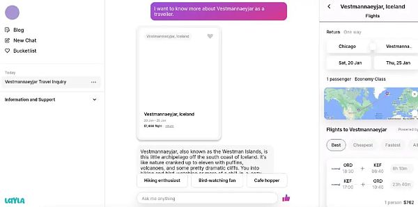 通过Layla,用户只需输入需求,便可轻松制定旅行计划 。例如输入目的地、出发时间和预算等,Layla便会有进一步的回应和引导,同时航班信息、价格等也可以直接在该页面获取。