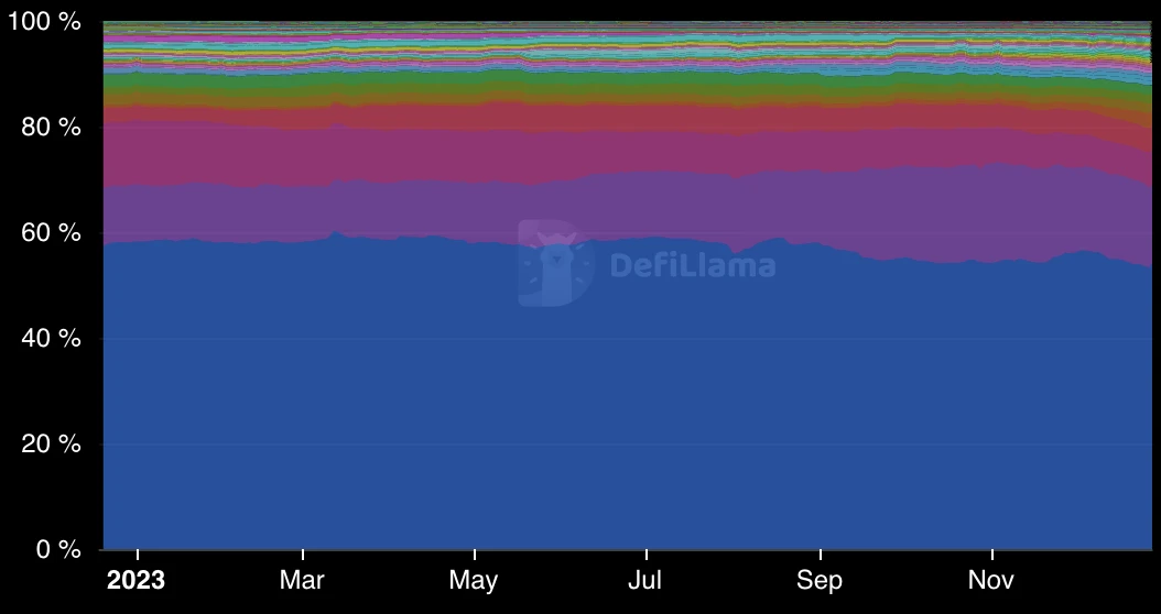 在本轮 BTC 生态主导的大行情之中,以太坊的疲软表现也让 EVM 生态整体失去光芒。链上数据也显示了以太坊生态在今年以来的长期疲软。DeFiLlama 数据显示,ETH 主网 TVL 在整个 DeFi 世界的占比已经从 2023 年初的 58.3% 下降到今日的 54.1% 。